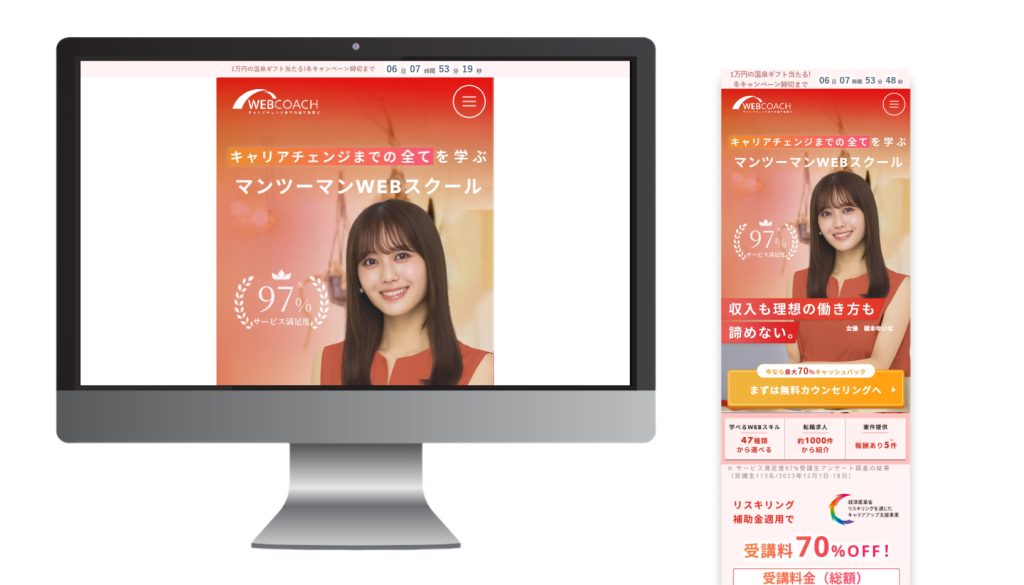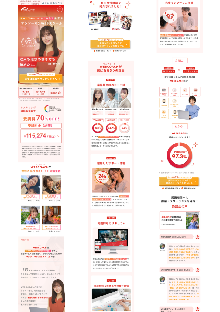 ランディングページ制作 2026年1月7日 最終更新日時 : 2026年1月7日 aya_tngc2 【製作時間】20時間【使用ソフト】Photoshop・illustrator・Figma・HTML・CSS・jquery【担当業務】デザイン・実装【意識した亊】スクロール離脱を防ぐためjqueryで動きをつけたLPを作成しました。